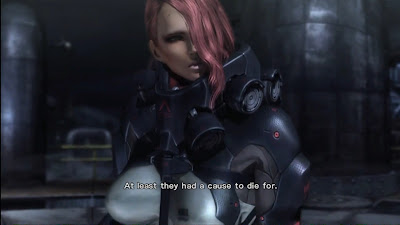 Sub-weapons in this game range from Rocket Launchers to 3-D holgraphic devices that display a female model meant to distract enemies. This is where the game begins to give some fan service, by attempting to blend stealth, and making references to the Metal Gear Solid series. I believe that attempting to blend stealth with the over the top action was an extremely smart call. In certain segments, where the enemies are not already aware of your presence. Raiden is able to use his many sub-weapons inspired and taken from previous Metal Gear games to lure and dispatch his enemies stealthily with a Ninja Kill. A Ninja Kill is simply a type of execution that can be activated from above or behind an unsuspecting foe, one that is shown by a quick cinematic. It would have been nice if they would included a few more Ninja Kill animation in order to prevent repetition. That's a very minor complaint though especially because, majority of player probably won't utilize stealth much, preferring to engage their foes head on. As I said including stealth was very smart, but I feel like it could of been expanded on a bit more. Trying to be stealthy in this game is almost too difficult seeing as the AI are very quick to detect you. Because, of this most people won't utilize the stealth. Perhaps I am wrong and thinking this, and they did this on purpose as to make people realize that this is supposed to be a full on action game with stealth being second.